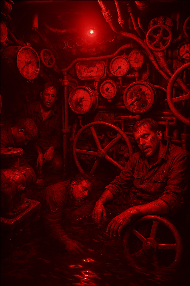 The red battle lights came on — dull illumination designed to preserve night vision and psychological edge. The sonar operator had his headphones on, hunched over the hydrophone stack, hands trembling as he tuned the filters.